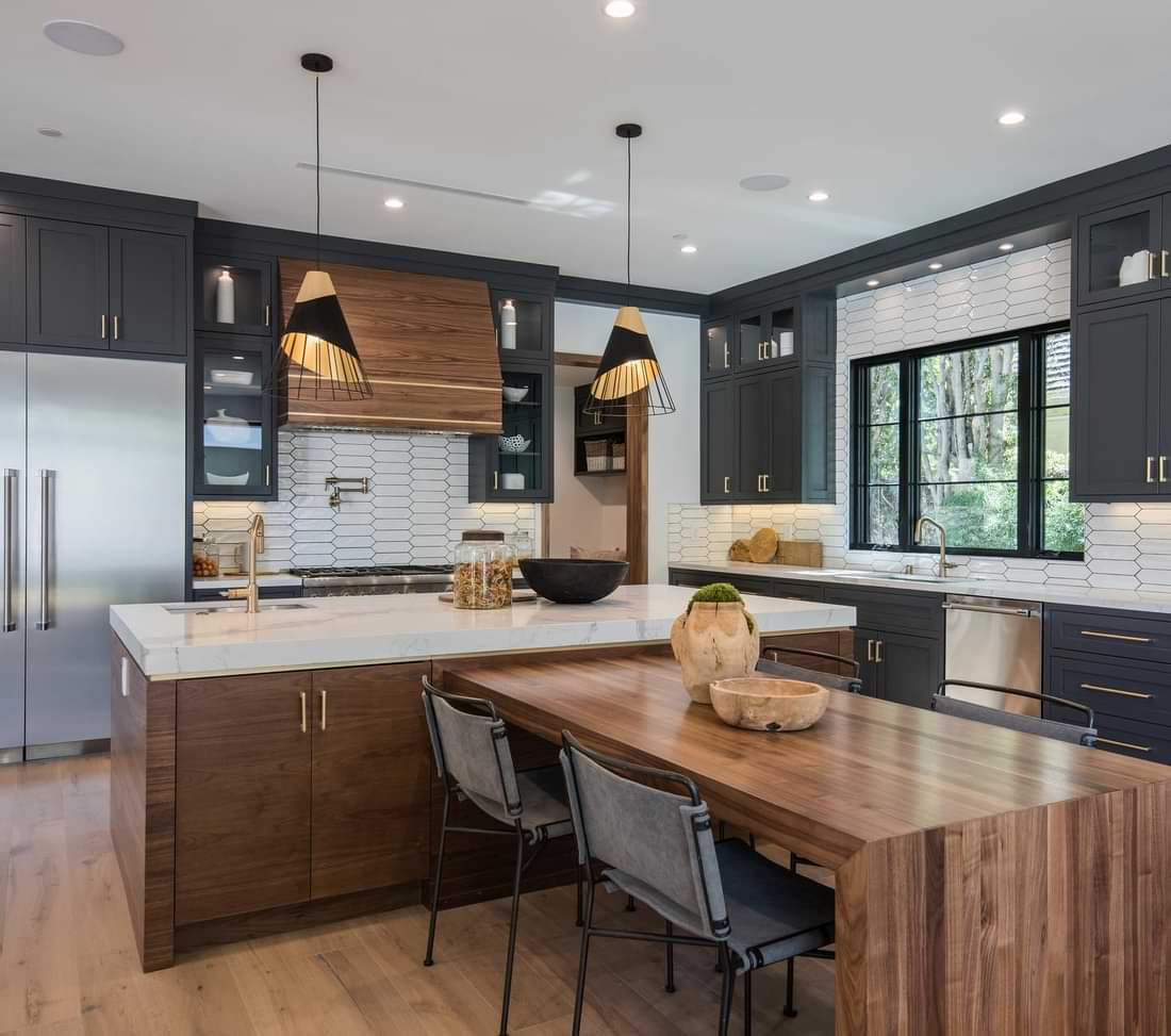 Custom cabinetry, professional-grade appliances, large island with seating, walk-in pantry, statement lighting.
